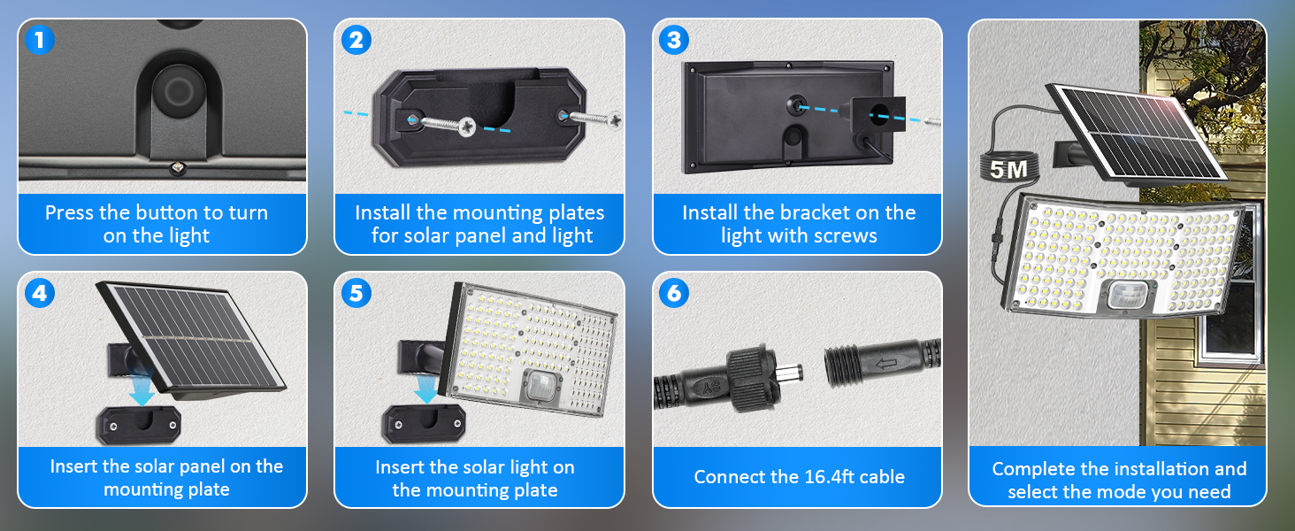 The solar security light uses polysilicon solar panels with high photoelectric conversion efficiency. And the motion sensor solar security light built-in 10000 mAh rechargeable battery provide faster charging and long endurance